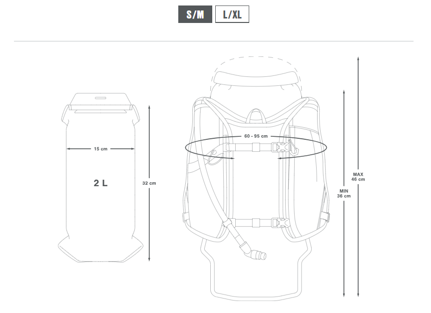 Vesten finnes i to størrelser for optimal passform, med høydejusterbare bryststropper og et spenne som inkluderer en nødsignalfløyte. Sidestroppene justeres for å eliminere bevegelse under syklingen. Slangeholder med magnetisk klemme holder væskeslangen lett tilgjengelig, men ute av veien.