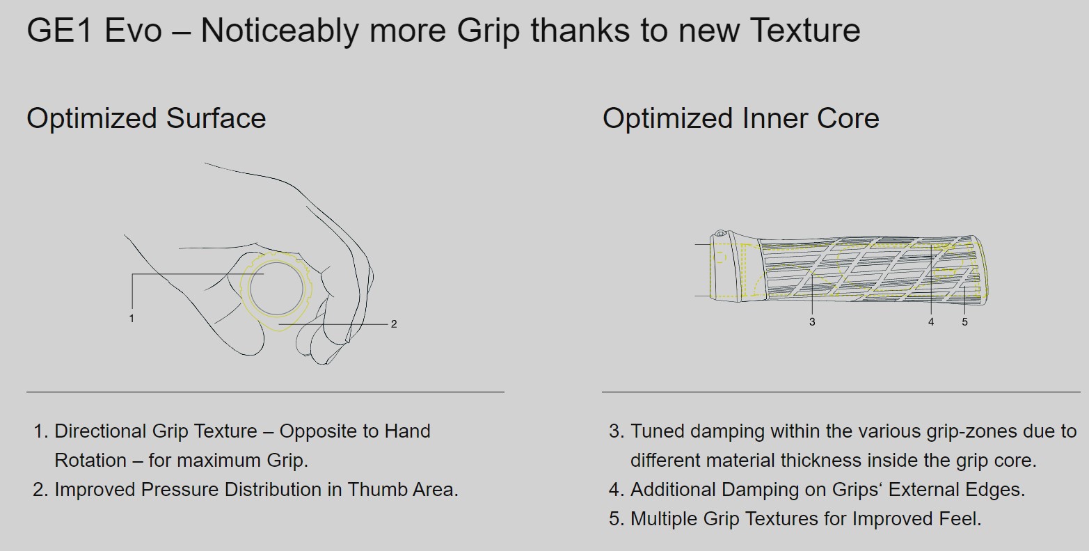 GE1 Evo Slim Factory er videreutviklingen av de vellykkede GE1 Slim Factory holkene. Disse holkene er rytterorienterte med ergonomisk grep for brede riser styrer. Takket være tilbakemeldingene samlet fra utallige ryttere i Enduro World Series har Ergon-designteamet lyktes med å forbedre den populære GE1 Slim Factory ytterligere i visse detaljer. Overflateteksturen er nå enda mer sklisikker, gummiblandingen er mykere, og den gir konstant og presist grep. Den støtter aktivt riktig overkropp/underarmstilling under downhillsykling ved å rotere grepsområdet mot styreakselen med 8%. På denne måten blir albuene automatisk løftet utover! Den smidde klemmen med fullt integrert grep som er koblet til den indre kjernen gir en myk og dempende grepkant. Du vil også oppleve mindre trykk på den følsomme ulnarnerven som er plassert på utsiden ved bruk av disse holkene som er kompatible med karbonstyrer. Anbefales for personer med små til normale hender eller for de som ønsker mindre diameter på holkene.