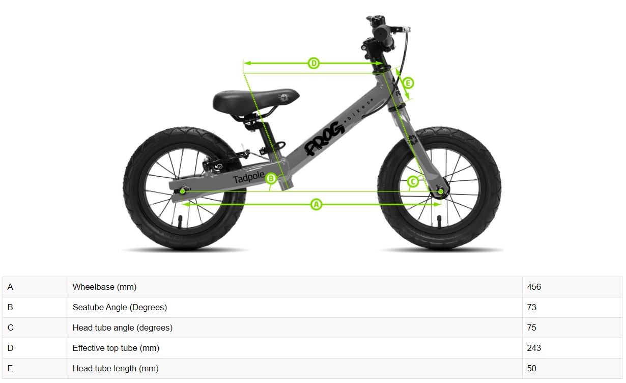 Tadpole Mini er den perfekte første sykkelen for småbarn, og er en morsom måte å introdusere barn for sykling på og for å utvikle god sykkelbalanse. Den har en lett og solid ramme og den er enkel å bære for voksne. Den har også bakbrems med hendel på styret for å gjøre barnet kjent med hvordan bremsing på sykler foregår. Den har setepinne med hurtigkobling som gjør det enkelt å justere høyden på setet, og styret har en sperre som gjør at barnet ikke kan vrenge styret under bruk.