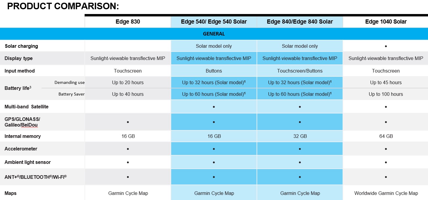 - Sammenlignet med Edge 540 Solar har Edge 840 Solar touchskjerm, dobbelt så stort minne og flere forhåndsinstallerte kart, i tillegg til et par ekstra funksjoner
