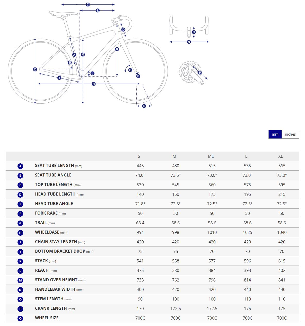 Kranksett: Shimano 105, 34/50 XS:170mm, S:170mm, M:172.5mm, M/L:172.5mm, L:175mm, XL:175mm