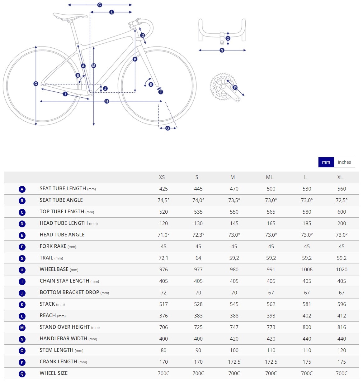 Kranksett: Shimano 105, 36/52 XS:170mm, S:170mm, M:172.5mm, M/L:172.5mm, L:175mm, XL:175mm