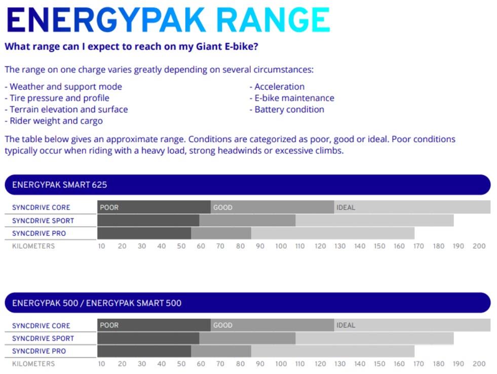 Rekkevidden på et fulladet batteri på en Giant elsykkel kan variere mye avhengig av mange forhold som den kombinerte vekten av syklisten og lasten (barnevogn, sidevesker osv), vindforhold, dekktrykk og dekktype, underlag, høydeforskjeller, temperatur, vedlikeholdet av elsykkelen og tilstanden til batteriet.