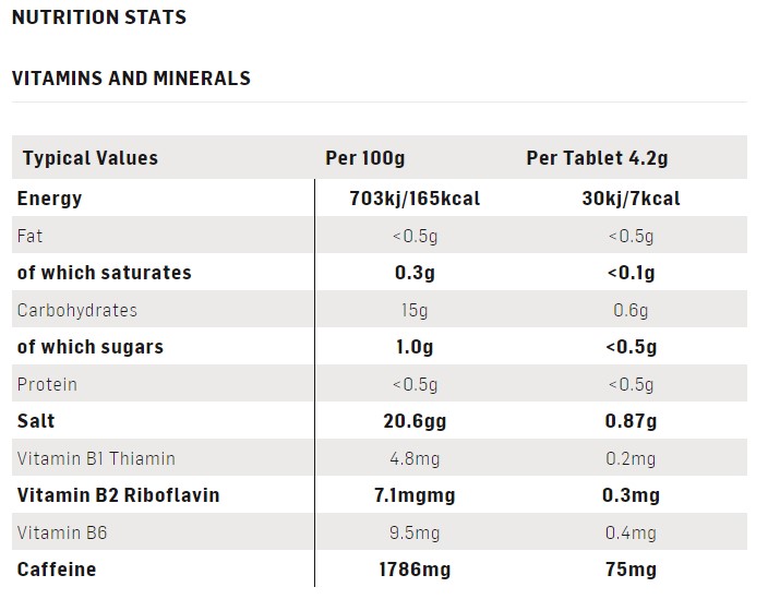 Ingredienser: Acid (Citric Acid), Acidity Regulator (Sodium Hydrogen Carbonate), Bulking Agent (Sorbitol), Sodium Chloride, Inulin, Calcium Carbonate, Natural Flavourings, Potassium Chloride, Colour (Sulphite ammonia caramel), Caffeine (1.8%), Tricalcium Phosphate, Magnesium Carbonate, Sweetener (Sucralose), Pyridoxine Hydrochloride (Vitamin B6), Riboflavin 5-phosphate-sodium (Vitamin B2), Thiamin Mononitrate (Vitamin B1)