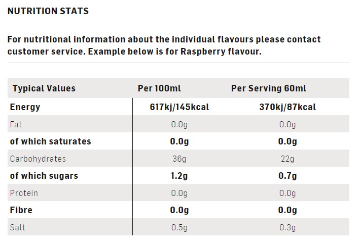 Ingredienser: Water, Maltodextrin (From Maize), Natural Flavour, Salt, Gelling Agents (Gellan Gum, Xanthan Gum), Acidity Regulators (Citric Acid, Sodium Citrate, Malic Acid), Sweeteners (Acesulfame K, Sucralose), Preservatives (Potassium Sorbate, Sodium Benzoate), Potassium Chloride, Magnesium Citrate