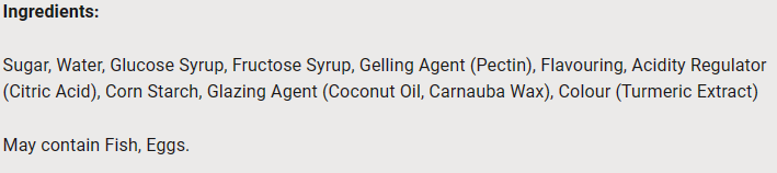 Ingredienser: Sugar, Water, Glucose Syrup, Fructose Syrup, Gelling Agent (Pectin), Flavouring, Acidity Regulator (Citric Acid), Corn Starch, Glazing Agent (Coconut Oil, Carnauba Wax), Colour (Turmeric Extract).