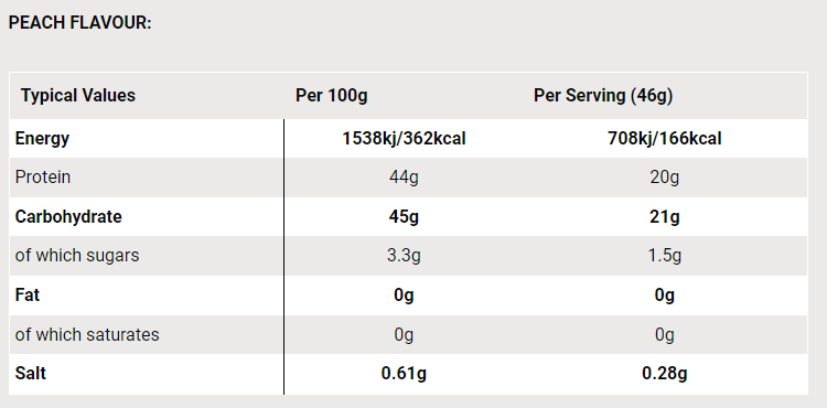 Ingredienser: Whey Protein Isolate (Milk) (50%), Maltodextrin (46%), Acidity Regulator (Citric Acid), Natural Flavourings, Anti-Foaming Agent (Silicon Dioxide), Sweetener (Sucralose), Colours (Beta Carotene, Beetroot Red).
