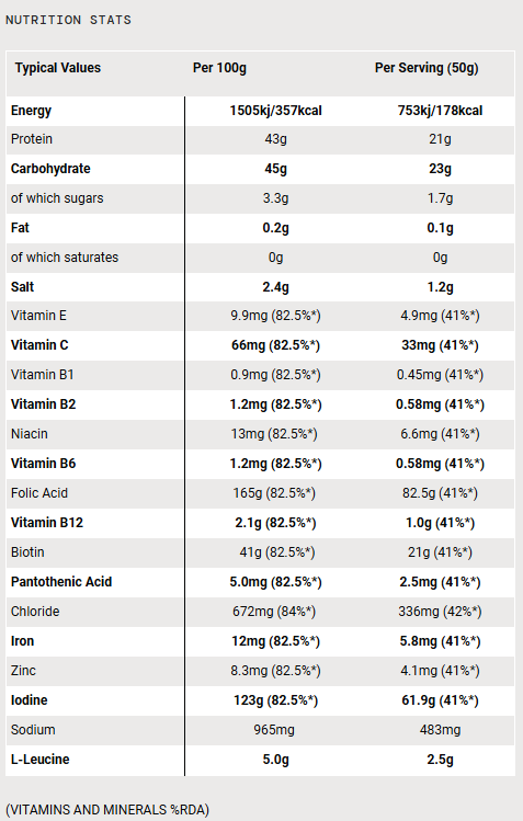 Ingredienser: Soya Protein Isolate (50%), Maltodextrin (44%), L-Leucine, Flavourings, Sodium Chloride, Colour (Beetroot Red), Acidity Regulator (Citric Acid), Vitamin and Mineral Blend (Vitamin C, Niacin, Ferric Pyrophosphate, Vitamin E, Zinc Sulphate, Pantothenic Acid, Vitamin B6, Vitamin B2, Vitamin B1, Folic Acid, Potassium Iodide, Biotin, Vitamin B12), Thickener (Xanthan Gum), Sweetener (Sucralose).