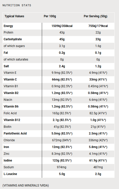 Ingredienser: Soya Protein Isolate (51%), Maltodextrin (44%), Flavourings, L-Leucine, Sodium Chloride, Vitamin and Mineral Blend (Vitamin C, Niacin, Ferric Pyrophosphate, Vitamin E, Zinc Sulphate, Pantothenic Acid, Vitamin B6, Vitamin B2, Vitamin B1, Folic Acid, Potassium Iodide, Biotin, Vitamin B12), Thickener (Xanthan Gum), Sweetener (Sucralose).